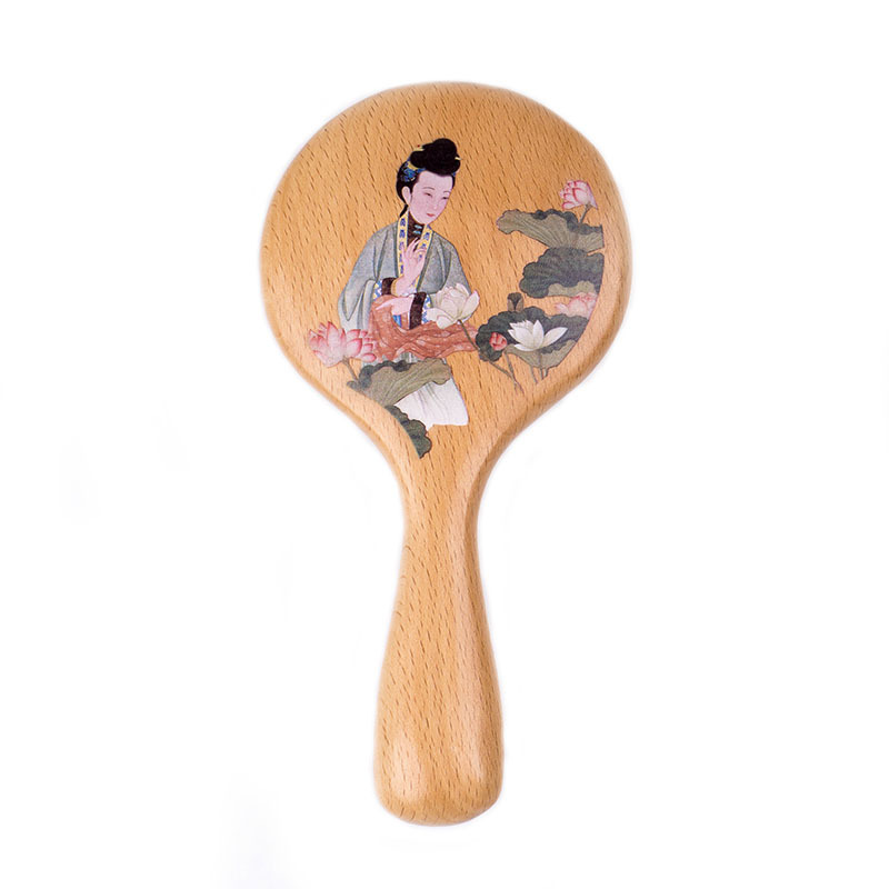 爆款清宫美人镜手柄手拿镜化妆镜进口榉木圆镜手持镜子女性馈赠