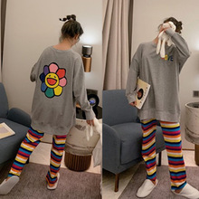 睡衣女长袖春秋冬季套装少女学生套装太阳花彩色条裤宽松大码家居