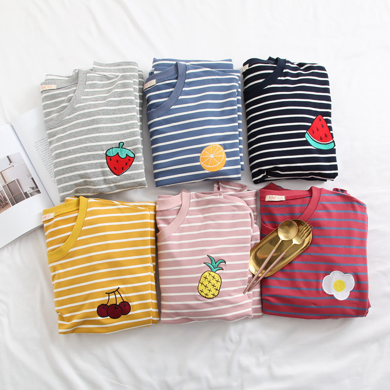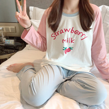 睡衣女长袖春秋白草莓插色套装针织棉大码学生少女两件套家居服